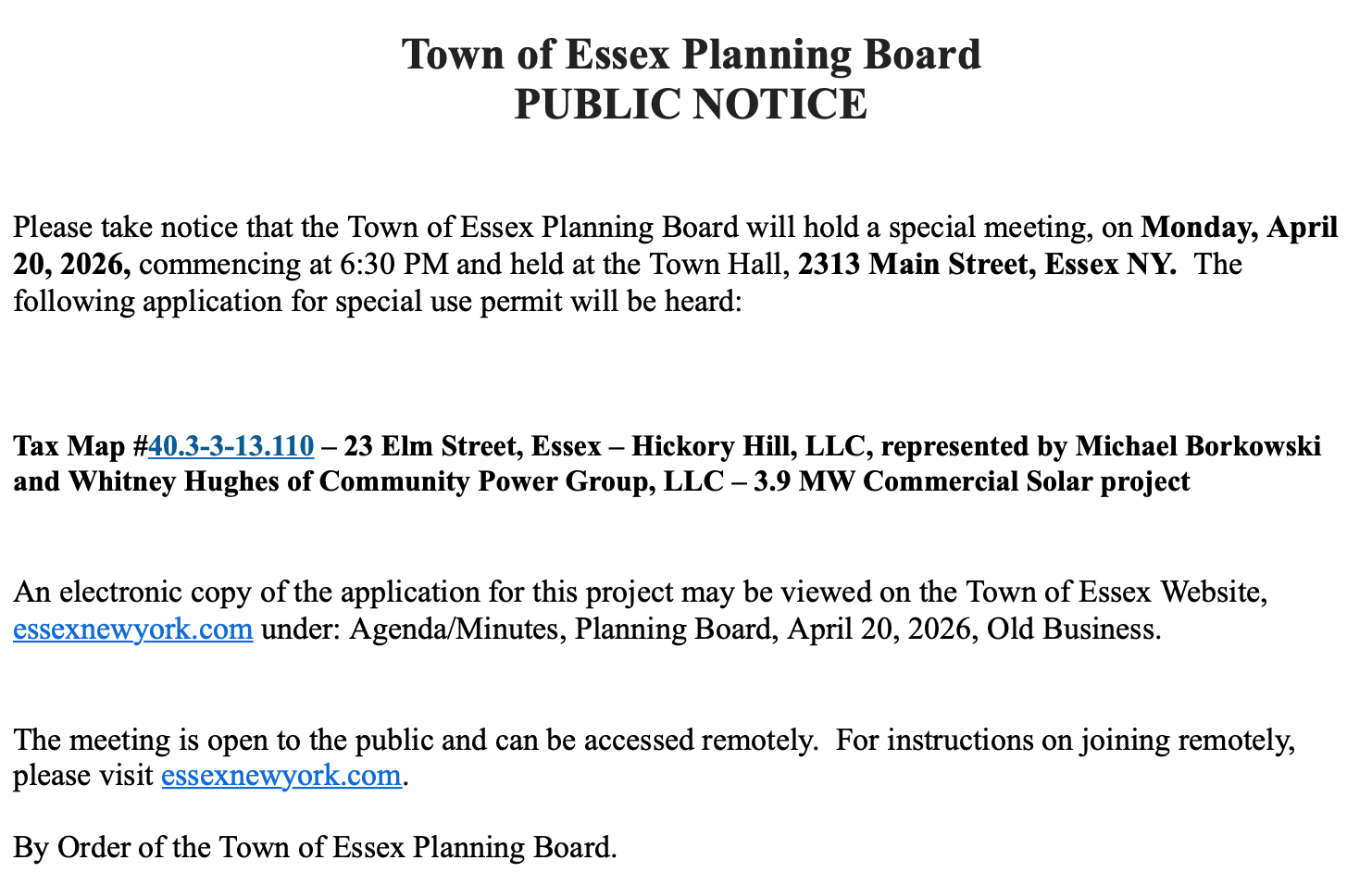 PROPOSED COMPREHENSIVE PLANPLEASE TAKE NOTICE that the Town Board of the Town of Essex, Essex County, New York, will hold a public hearing on May 14, 2026, at 5:30PM at the Essex Town Hall, 2313 Main Street, Essex, New York, to consider the adoption of an updated Comprehensive Plan for the Town of Essex.