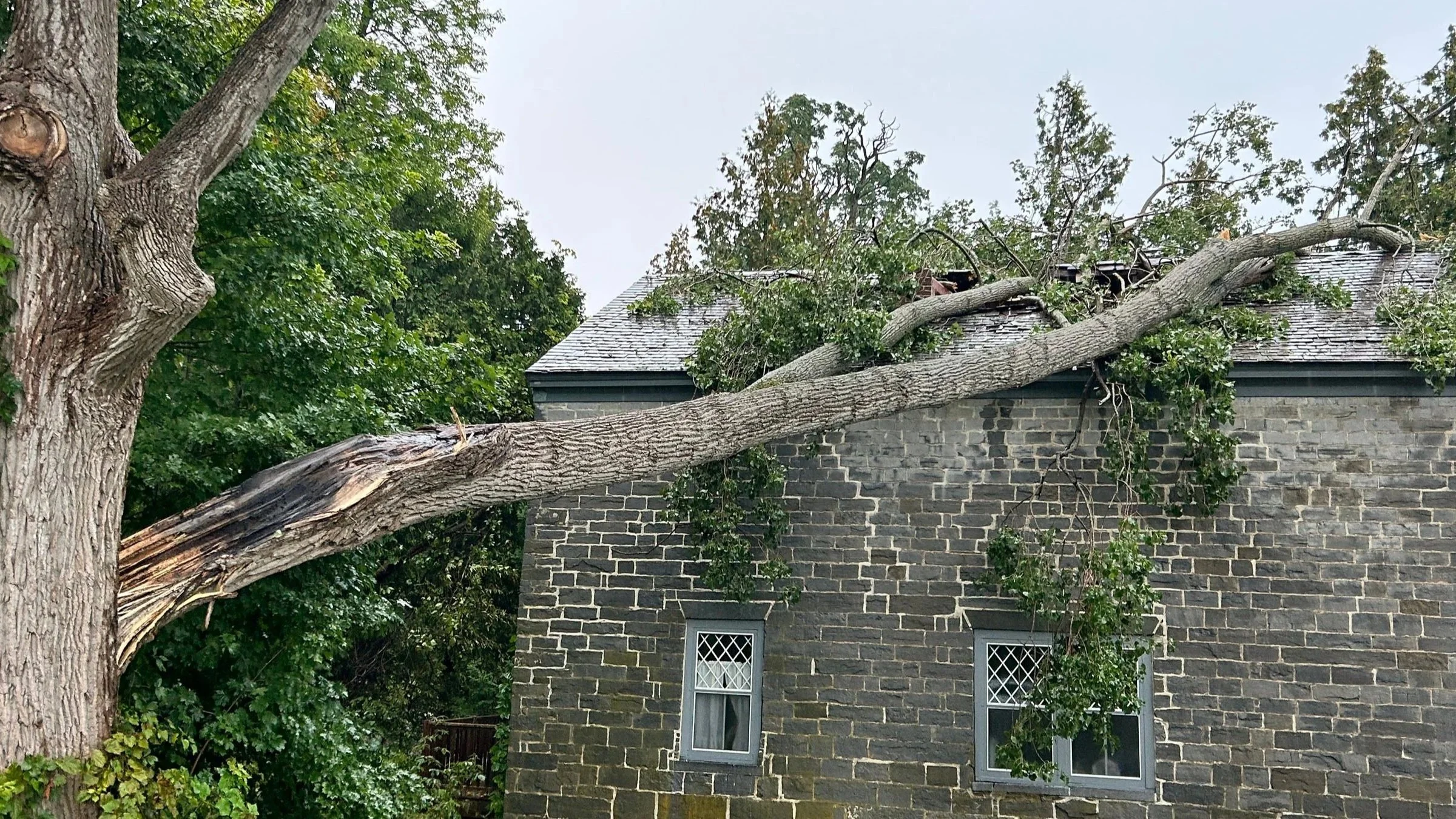 Friday, September 8, 2023 – Precision Tree Services and Luck Brothers come to discuss removal of tree limb. Extra parts of limb are removed, the main limb remains on the building overnight with tarp over it.